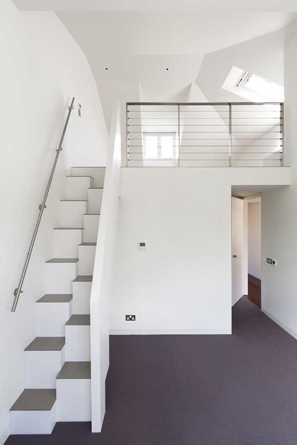 Bạn nghĩ sao nếu sử dụng mẫu cầu thang cho nhà nhỏ hẹp này? Hai vế cầu thang được thiết kế liền nhau với các bậc so le vô cùng độc đáo. Nó không chỉ tạo ra nét thu hút cho ngôi nhà mà còn đảm bảo cho hai người có thể đi song song với nhau cùng lên hoặc xuống. Nó hoàn toàn phù hợp với việc liên kết giữa không gian tầng dưới với tầng gác xép. Bạn có thể sử dụng cầu thang bằng gỗ, tận dụng cầu thang trở thành tủ đựng đồ hoặc khu vực trang trí cũng rất độc đáo và thu hút. Tay vịn cầu thang bằng kim loại được gắn trực tiếp vào tường nhằm tiết kiệm diện tích tiếp xúc với bề mặt, là một cách để tạo nên sự phóng khoáng cho ngôi nhà.