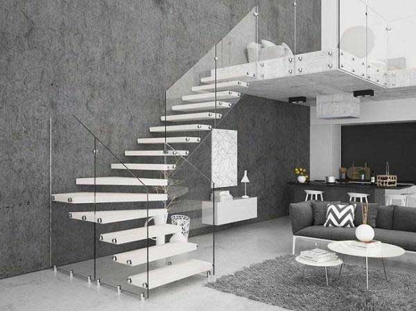 Thiết kế cầu thang màu trắng trong suốt vô cùng hợp với tone màu xám chủ đạo của ngôi nhà. Cầu thang bậc hở gán trực tiếp trên tường với thanh chán là kính trong suốt tạo cảm giác tinh tế, hiện đại tuyệt đối. Nhưng sẽ phù hợp nhất nếu bạn không sợ độ cao bởi đây là một thiết kế tạo cảm giác khá mạo hiểm.