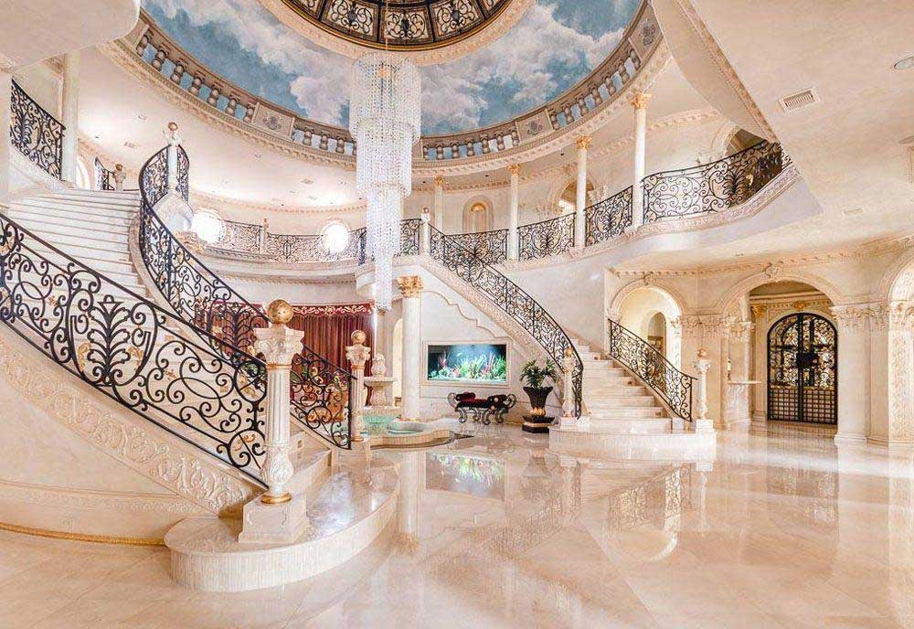 Chắc chắn một điều rằng, trong cuộc sống ai cũng từng có ít nhất một lần suy nghĩ mong muốn được làm công chúa-hoàng tử. Trong thực tế, bạn vẫn có khả năng để mình trở thành công chúa- hoàng tử nếu bạn được sống trong một thiết kế nhà ở như vậy. Đây là một mẫu thiết kế nhà ở mang phong cách hoàng gia tuyệt đẹp. Ngoài những nét đặc sắc trong phong cách thiết kế này của sàn đá tự nhiên, mái vòm cao được vẽ tranh trần, đèn chùm sang trọng thì cầu thang cũng là một chi tiết thiết kế vô cùng nổi bật với hai nhịp dài riêng biệt theo hai phía, trụ cầu thang và thanh che chắn cũng được chạm khác rất nhiều hoa văn cầu kỳ, độ dốc, độ xoắn cũng được tính toán hết sức tỉ mỉ tạo nên một tuyệt phẩm.