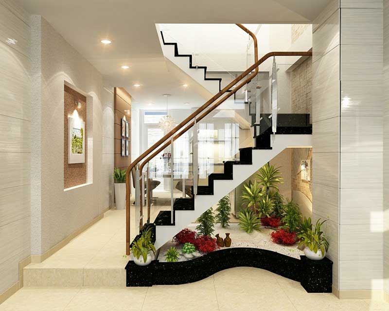 Cầu thang kính tay vịn gỗ đơn giản, phòng khách trang trí tươi sáng, nhưng nhờ cách trang trí gầm cầu thang bằng những tiểu cảnh xanh mát, đã tôn lên vẻ đẹp tự nhiên rất đỗi mới lạ của gian phòng khách. Nếu muốn nét mới lạ, độc đáo riêng cho mẫu cầu thang này việc bố trí những không gian hoàn hảo như: cây xanh dưới gầm cầu thang sẽ là sự lựa chọn hoàn hảo để thu hút những ai lần đầu có dịp chiêm ngưỡng ngôi nhà của bạn.