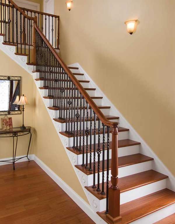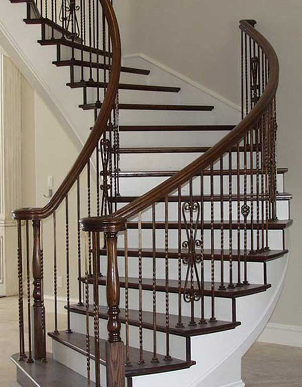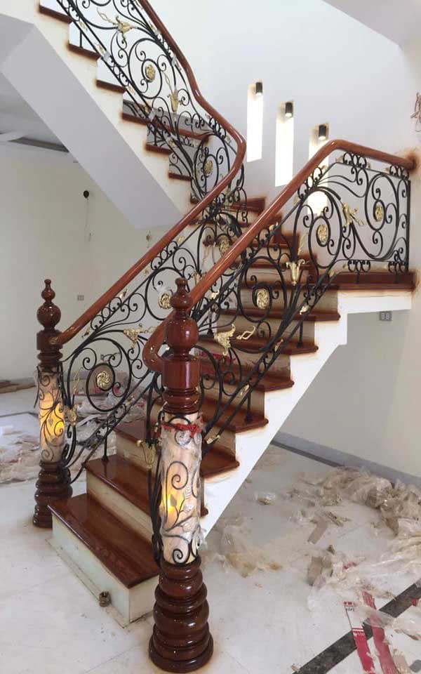 Các mẫu cầu thang tay vịn gỗ với phần sắt được uốn nghệ thuật cũng rất phổ biến. Lan can sắt nghệ thuật này tạo sự phá cách, ra khỏi khuôn mẫu cứng nhắc gò bó mà mang đến sự mềm mại cho không gian. Sắt đặc vuông được uốn thành hình hoa văn, là điểm nhấn vô cùng thu hút.