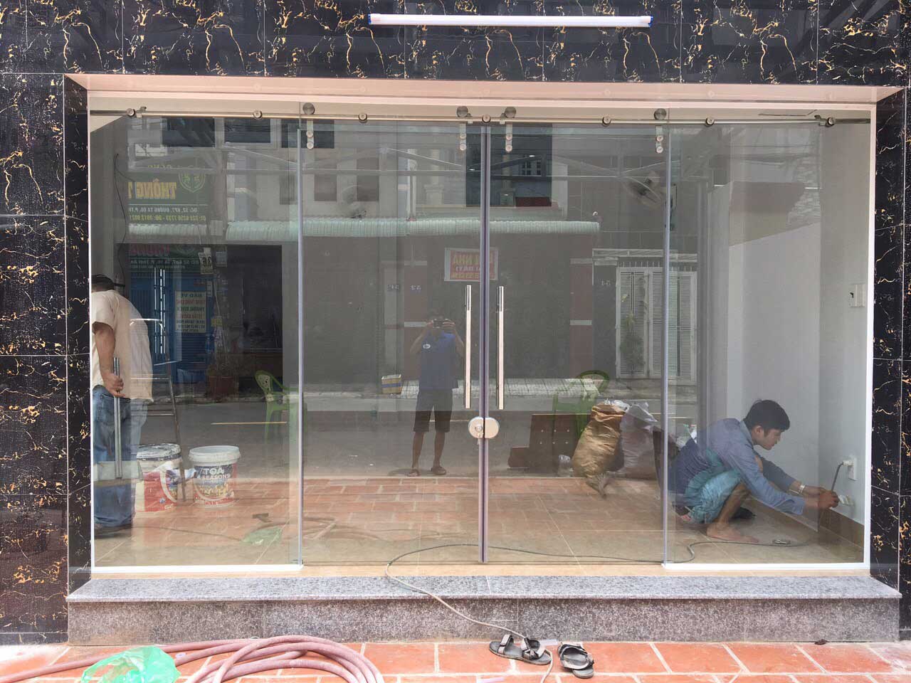 Bước 4: Tiến hành lắp đặt cửa kính cường lực 4 cánh theo đúng bản vẽ. Chú ý những đường keo phải kín, hệ thống phụ kiện được cố định chặt.