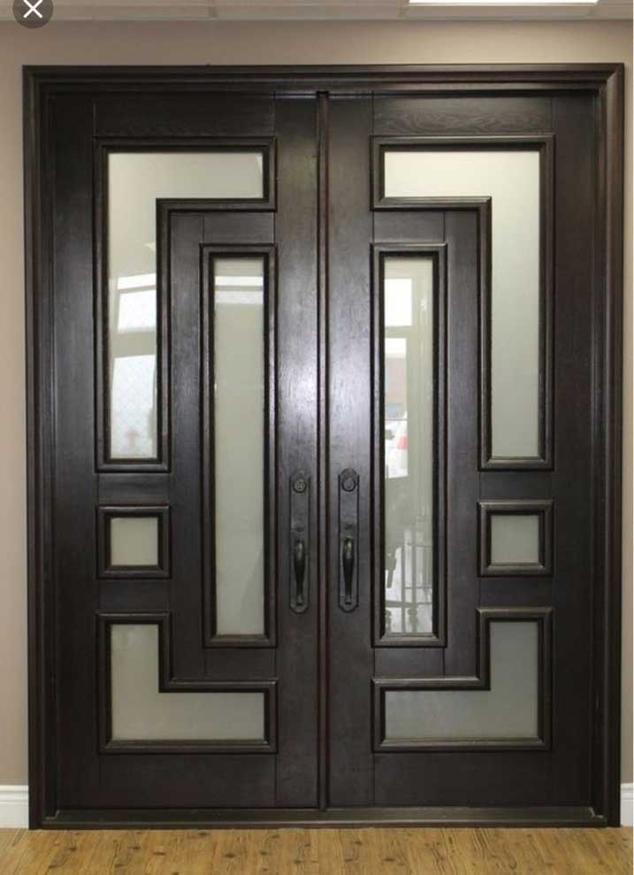 Mẫu cửa sắt 2 cánh giả gỗ đẹp đầu tiên là mẫu cửa với phần khung sắt được sơn trắng hoặc màu kem trông giống với gỗ công nghiệp gia công hiện nay kết hợp với tấm kính chắn mờ hoặc kính cường lực phân chia thành các ô cửa xếp so le nhau hoặc xếp thẳng hàng, thẳng cột với nhau. Hoạ tiết hoa văn sử dụng tối giản, hoặc không sử dụng. Với mẫu cửa sắt 2 cánh giả gỗ này phù hợp với ngôi nhà có phong cách kiến trúc hiện đại. Có thể sử dụng làm cửa chính, cửa thông phòng hoặc cửa thông ra ban công của ngôi nhà.