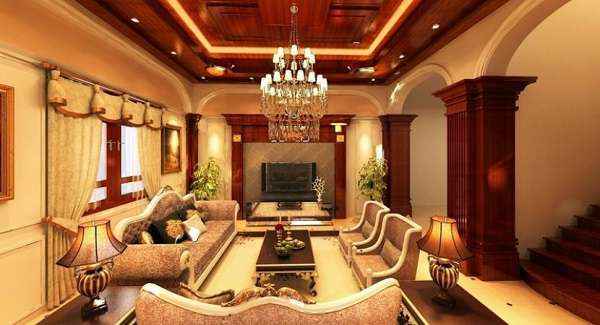Khoảng không gian giật cấp của trần thạch cao vẫn sử dụng đèn chạy viền ánh sáng vàng để nổi bần bật màu sơn giả gỗ. Đường viền ngoài lắp led trắng để tạo điểm sáng nhấn bộ bàn ghế cầu kỳ bên dưới, chi tiết cầu kỳ ở bên dưới. Cả không gian được chú ý tập trung vào chiếc đèn chùm thả ở vị trí chính giữa của ngôi nhà. Mẫu đèn này có thiết kế ba tầng với 2 tầng là bóng đèn lắp quanh trục tròn và khu vực dải dây thả xuống có màu vàng đồng. Chỉ cần bật công tắc điện, cả không gian chìm vào trong sự cổ điển, sang trọng, quý phái.