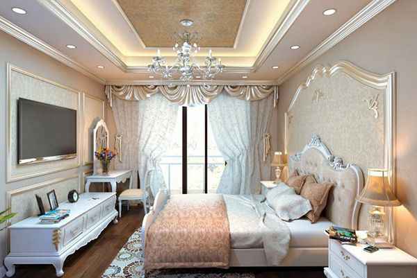 Một mẫu phòng ngủ theo phong cách cổ điển châu Âu với một chút lãng mạn, một chút cổ điển, và không thể thiếu đi sự sáng trọng, tỉ mỉ trong từng chi tiết. Nhìn thấy rõ đồ nội thất với trang trí được sơn vàng bắt mắt. Giường ngủ được bọc vải da mịn cực kỳ đẳng cấp kết hợp với hoa văn cổ điển đầy sang trọng. Và phần mẫu trần thạch cao giật cấp là yếu tố để hoàn thiện vẻ đẹp của căn phòng. Với phần diện tích bên trong trần đi cùng với hoạ tiết hoa văn, chính giữa sử dụng đèn mạ bạc nổi bật. Mẫu đèn này có kích thước nhỏ gọn, phù hợp diện tích phòng.