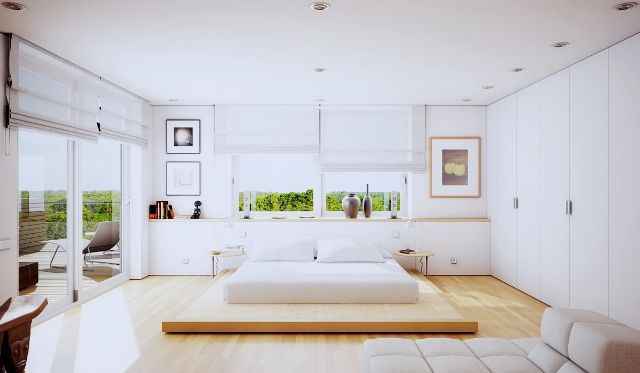 Mẫu thiết kế nội thất phòng ngủ màu trắng này được lấy cảm hứng từ những căn phòng ngủ của Nhật Bản. Nó thích hợp với những căn biệt thự nhà vườn có diện tích rộng. Ban công phòng ngủ rộng lớn kết hợp với tone màu trắng chủ đạo mang đến không gian choáng ngợp cho phòng ngủ. Nội thất đơn giản cùng với gam màu nâu sáng của sàn gỗ tạo nên không gian rộng rãi những ngập tràn sức sống.