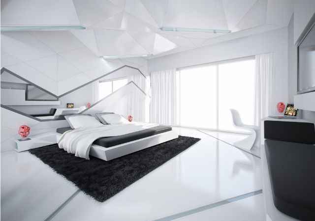Thiết kế nội thất phòng ngủ màu trắng đặc biệt mà chúng tôi muốn giới thiệu đến các bạn đó là phong cách lập thể hiện đại. Phần trần nhà và tường nhà được thiết kế với dạng hình khối đặc biệt, đầy sáng tạo và sang trọng tạo cảm giác rộng rãi, thoải mái. Tối giản sự xuất hiện của những món nội thất càng làm cho không gian trở nên rộng hơn. Tấm thảm trải sàn màu đen nổi bật tạo điểm nhấn cho căn phòng.