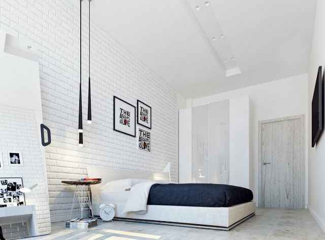 Nếu bạn yêu thích phong cách đơn giản nhưng không đơn điệu, nhám chán thì có thể tham khảo mẫu thiết kế nội thất phòng ngủ màu trắng này. Mẫu thiết kế đơn giản nhưng không mất đi sự sang trọng. Bạn không cần quá cầu kì và mất nhiều thời gian trang trí, chỉ cần với tấm xốp dán tường giả gạch màu trắng, cùng với một số chiếc đèn trang trí cách điệu hình giọt nước là đã tạo được không gian phòng ngủ mag dấu ấn của riêng bạn rồi.