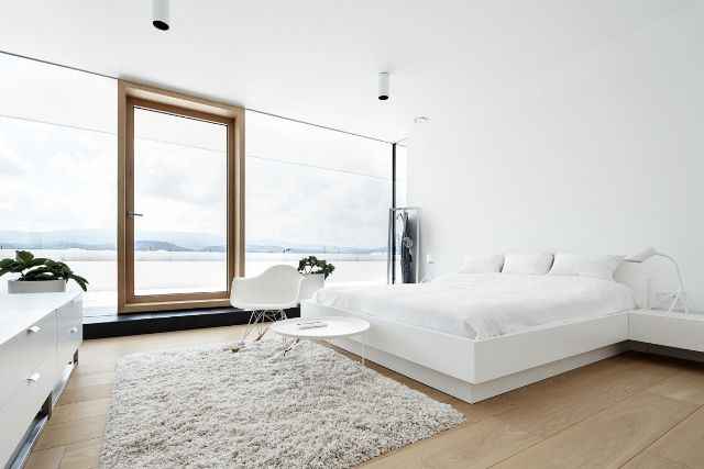 Một căn phòng ngủ với view biển quá đẹp. Nội thất của căn phòng hoàn toàn là màu trắng, kết hợp với sàn gỗ màu nâu sáng mang đến không gian hoàn hảo cho căn phòng ngủ. Chiếc giường hộp màu trắng đặt giữa phòng kết hợp với chiếc thảm trải sàn lông dày đặt giữa phòng mang đến cảm giác thư thái, thoải mái cho giả chủ sau những giờ phút làm việc mệt mỏi.