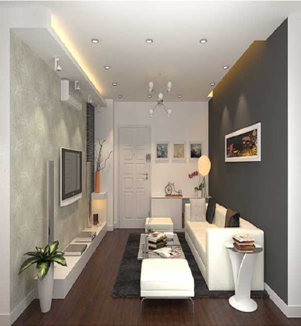 Mẫu phòng khách tiếp theo được dành cho không gian nhà ống, mặc dù không có cửa sổ nhưng căn phòng khách này lại không hề có cảm giác bí bách, chật trội vì căn phòng này được sử dụng với một gam màu sáng. Từ màu sơn của tường đến màu sắc của nội thất đều được lựa chọn là màu trắng sáng. Ngoài ra chỉ duy nhất bức tường phía sau bộ ghế salon được lựa chọn là màu xám nhằm tạo điểm nhấn và làm nổi bật bức tranh gắn trên tường.