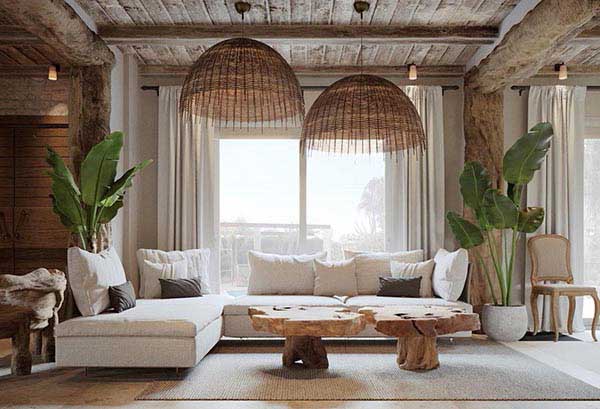 Mẫu thiết kế phòng khách có cửa sổ theo phong cách tropical sẽ gợi ý cho những ai yêu thích thiên nhiên. Nội thất mềm mại với gam màu nâu nhẹ nhàng và chất liệu mây tre làm điểm nhấn sẽ mang đến sự thư thái cho toàn bộ không gian. Đặc biệt, cửa sổ được thiết kế rộng mở theo toàn bộ chiều dài của không gian sẽ giúp bạn có thể thu trọn vẹn không gian xanh mát bên ngoài. Cảm giác như bạn đang sống ở một ngôi nhà trong rừng.