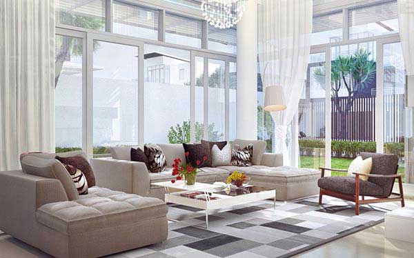 Với những ai yêu thích một không gian sống hiện đại thì mẫu phòng khách có cửa sổ này bạn nên ghi lại. Gam màu trắng cùng với thiết kế cửa sổ bao quanh càng khiến cho không gian trở nên rộng lớn hơn. Bạn có thể sử dụng những mẫu sô pha thấp, đơn giản kết hợp với thảm trải sàn họa tiết hình học nhằm tạo điểm nhấn cho toàn bộ thiết kế. Thêm vào một vài bình hoa tươi cho ngày mới thêm rạng rỡ nhé.
