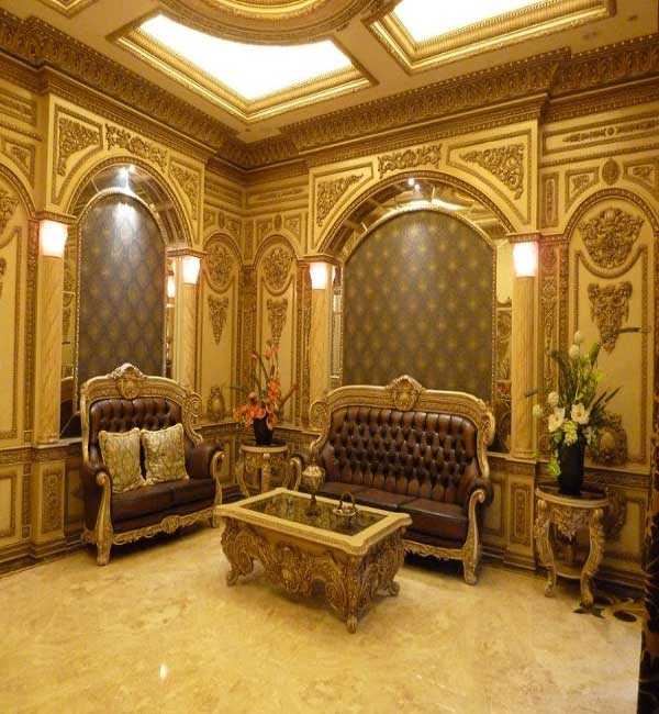 Một phòng khách với vẻ đẹp kiêu sa. Mọi đồ vật trong căn phòng này được kết hợp hài hòa, đan xen với nhau tạo nên một vẻ đẹp tuyệt mĩ. Bộ bàn ghế salon với màu sắc, hoa văn cổ điển tinh tế hòa cùng với chiếc bàn trà trắng mang đến một vẻ đẹp vô cùng sang trọng hiện đại và quyền quý. Nhưng điểm nhấn nổi bật nhất của căn phòng này là bức tường với chi tiết hoa văn, mới lạ, độc đáo.