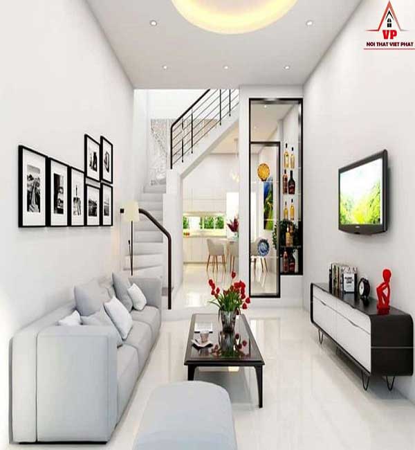 Có lẽ với căn phòng khách nhà ống tương đối hẹp về diện tích chiều rộng thì việc sở hữu một căn phòng khách như trên là hoàn toàn hợp lí. Tất cả mọi đường nét, chi tiết đều được trang trí hài hòa, cân đối. Với một bộ bàn ghế salon màu trắng vuông vức, gọn gàng kết hợp chuẩn với một bàn trà bằng thủy tinh trong suốt. Vừa đáp ứng được đầy đủ công năng vẫn còn một khoảng trống rộng, thông thoáng.