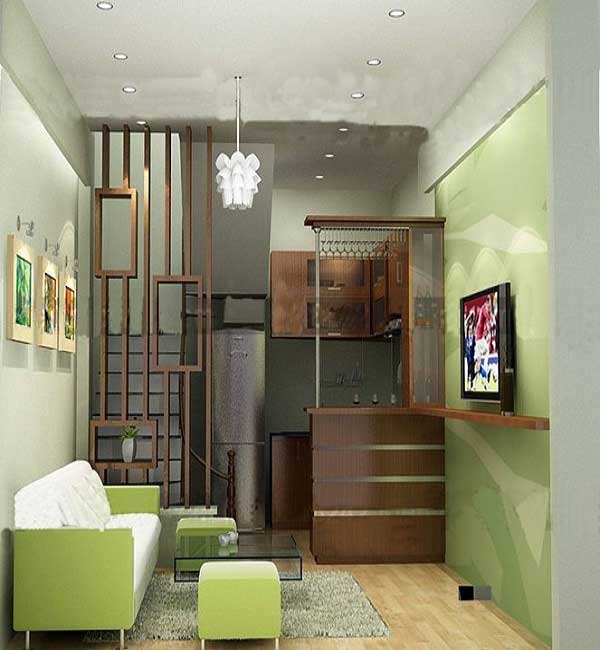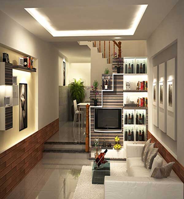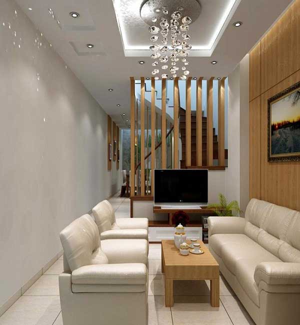 Đối với những lô đất hẹp về diện tích đặc biệt là ở khu vực thành phố thì khi thiết kế chúng ta cũng phải cân nhắc diện tích sao cho hợp lí, nội thất trang trí làm sao để vừa mắt. Đối với mẫu thiết kế trên đáp ứng hoàn toàn yêu cầu đối với một phòng khách hạn chế về diện tích. Với một bộ ghế dài để giáp tường, chiếc bàn đen dài tiết kiệm diện tích.