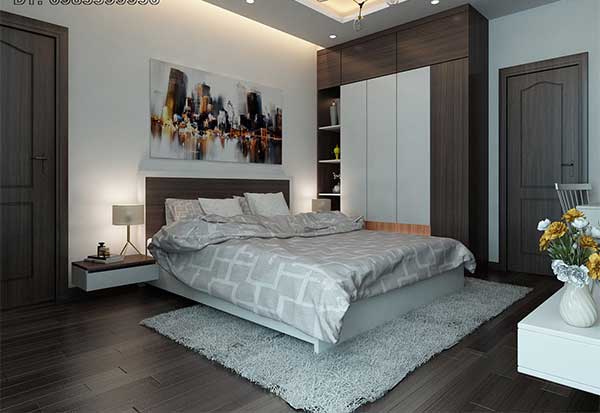 Thiết kế phòng ngủ chung cư này mang phong cách đơn giản và tiện nghi, nội thất trong phòng chủ yếu bằng gỗ công nghiệp tạo nên vẻ đẹp hiện đại nhưng phù hợp với chi phí. Bạn có thể trang trí cho không gian bằng thảm lông êm ái, một vài bình hoa tươi hay đèn ngủ ấm áp để tăng sự thoải mái cho căn phòng. Một bức tranh nghệ thuật trừu tượng khiến cho phòng ngủ của bạn trở nên thú vị hơn rất nhiều.