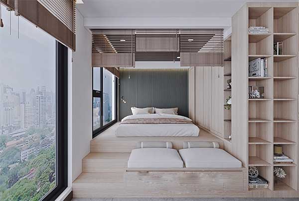 Phòng ngủ được thiết kế vô cùng độc đáo, theo hơi hướng của phong cách Nhật Bản, bạn cần phải bước lên cầu thang để đến được giường ngủ, nó tạo nên sự thu hút và thú vị cho căn phòng. Hệ cửa sổ được thiết kế rộng mở mang đến cảm giác như căn phòng của bạn “lửng lơ” giữa trời. Gam màu nâu nhẹ nhàng của nội thất tạo nên vẻ đẹp tự nhiên của văn phòng mà không cần sự tham gia quá nhiều của các loại sơn hay giấy dán tường, nó là cách giúp bạn tiết kiệm chi phí hiệu quả.