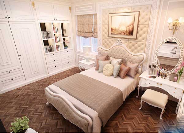 Đây cũng là một mẫu phòng ngủ chung cư được lấy ý tưởng từ phong cách tân cổ điển. Những đường nét được sử dụng trong kiến trúc và nội thất “tiết kiệm” hơn so với phong cách cổ điển, nhưng vẫn đảm bảo được sự sang trọng và đẳng cấp trong không gian Bạn có thể thiết kế một ô cửa sổ nhỏ, giúp mang ánh sáng vào không gian của căn phòng. Mặc dù diện tích không quá lớn, nhưng bạn hoàn toàn có thể sắp xếp tủ quần áo, bàn trang điểm trong cùng một không gian. Chú ý sự đồng điệu về tông màu sẽ giúp cho phòng ngủ của bạn đẹp hơn rất nhiều.