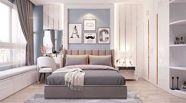Với gam màu xám và trắng làm chủ đạo, mẫu phòng ngủ chung cư này hoàn hảo cho những ai yêu thích sự sạch sẽ và gọn gàng. Đồ nội thất sử dụng trong phòng không nhiều bao gồm bàn trang điểm, tủ quần áo, giường ngủ… nhưng lại được sắp xếp vô cùng hoa học. Kết hợp với các chi tiết trang trí như rèm cửa, tranh vẽ, thảm trải sàn… và một chút tinh tế trong việc lựa chọn ánh sáng. Không gian ngôi nhà của bạn sẽ luôn sáng, rộng rãi mà không mất đi yếu tố nghệ thuật.