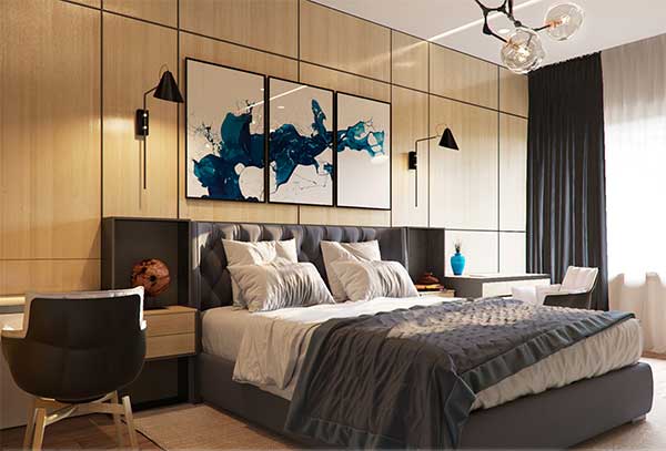 Đây là một trong những mẫu phòng ngủ chung cư dành cho những quý ông lịch thiệp và độc thân. Gam màu xanh thân mạnh mẽ và đẳng cấp thể hiện tính cách của chủ nhân căn phòng. Bạn có thể thêm vào trong không gian một vài chiếc ghế sô pha đơn, dành một góc cho bàn làm việc cùng với đó là trang trí bằng cây xanh, đèn trang trí độc đáo. Tổng thể không gian mang đến cảm giác hài hòa và thư giãn vô cùng.