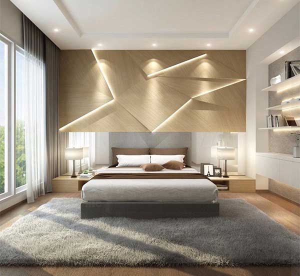 Sự gọn gàng và tinh tế chiếm chọn phong cách của mẫu phòng ngủ chung cư này. Giường ngủ được thiết kế đơn giản, độ cao vừa phải giúp không gian trở nên rộng và thoáng. Gam màu xám luôn đảm bảo sự sạch sẽ căn phòng. Điểm nhấn trong mẫu phòng ngủ chung cư này nằm ở bức tường. Việc đan xen hệ thống chiếu sáng với kiến trúc này mang đến ánh sáng nhẹ nhàng và vô cùng ấm áp. Thảm trải sàn cũng được sử dụng nhằm tăng tính thẩm mỹ cho không gian của ngôi nhà.
