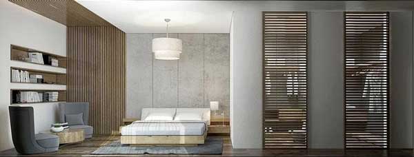 Đẳng cấp có thể là cách miêu tả chính xác về không gian này bởi từ cách bày trí nội thất, tone màu và chất liệu toát lên vẻ sang trọng, lịch lãm khó cưỡng. Căn phòng thích hợp với những ngôi nhà có không gian rộng do phần trống trong phòng khá nhiều, ưu điểm đầu tiên chính là sự rộng rãi. Chiếc giường kiểu Nhật cỡ lớn cùng với cách bài trí đầu giường tương đối tỉ mỉ với các khối trụ dọc khiến cho căn phòng trông như cao hơn.