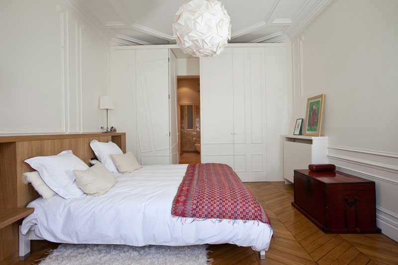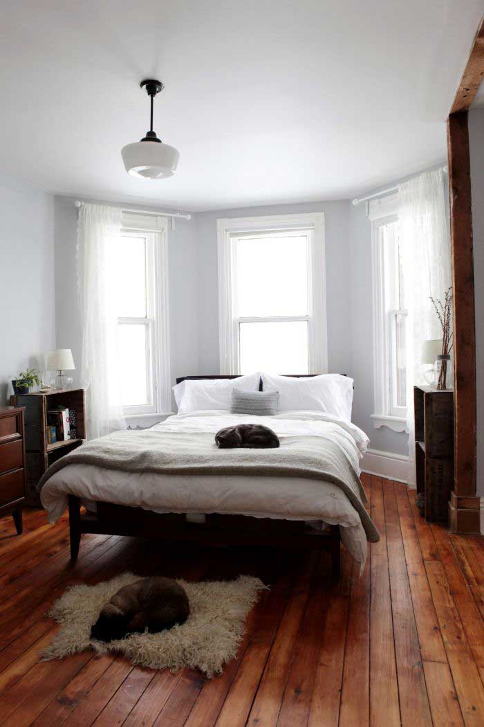 Nếu căn phòng của bạn có diện tích lớn. Có thể bạn sẽ thấy sàn gỗ hơi nhàm chán và không bắt mắt. Chính vì vậy, bạn có thể học hỏi theo mẫu nội thất phòng ngủ sàn gỗ này bằng cách sử dụng thảm để có sự mới lạ hơn. Nhưng chắc chắn rằng, với tông màu sáng của sàn gỗ sẽ tạo nên một điểm thích thú, độc đáo và mới lạ cho căn phòng của gia đình mình.