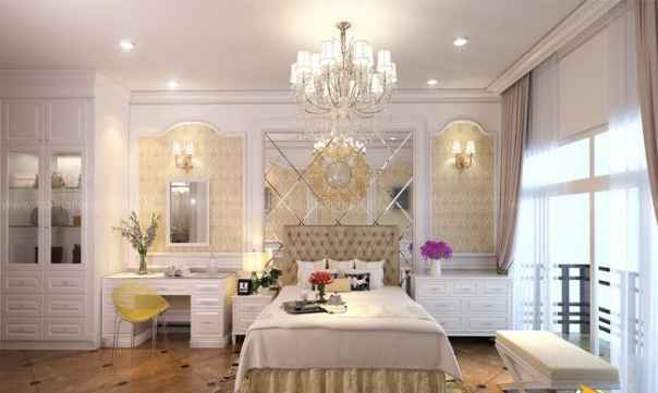 Toàn bộ hệ thống nội thất trong căn phòng từ giường ngủ, bàn trang điểm đến ga trải giường, màu sắc của đèn chùm đều là màu trắng. Nó làm cho căn phòng nhẹ nhàng những không hề nhạt nhòa. Những đường phào chỉ PU trên các cạnh tường giúp cho căn phòng có những đường cong mềm mại, xóa bỏ đi những góc cạnh sắc nhọn. Phòng ngủ được thiết kế cửa kính với diện tích rộng đi kèm với rèm cửa màu trắng, vừa tạo nên sự sang trọng vừa tận dụng tối đa ánh sáng tự nhiên cho phòng ngủ.