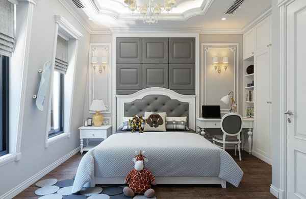 Phòng ngủ thiết kế theo phong cách tân cổ điển dùng màu xanh làm chủ đạo thường được thiết kế dành cho các bé mà chủ yếu là bé trai .