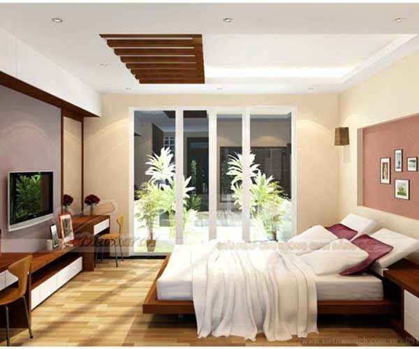 Với một căn phòng ngủ thiết kế đơn giản như thế này thì mẫu trần thạch cao kết hợp gỗ là sự lựa chọn hoàn hảo, hệ thống cửa, tủ, ghế, giường, sàn nhà tất cả cũng được thiết kế bằng gỗ mang lại vẻ đẹp hết sức tự nhiên, gần gũi khi bước chân vào căn phòng. Việc tận dụng ánh sáng tự nhiên tối đa không những tốt cho sức khỏe mà còn giúp không gian sống trở nên gần gũi với thiên nhiên, cây cỏ hơn rất nhiều.