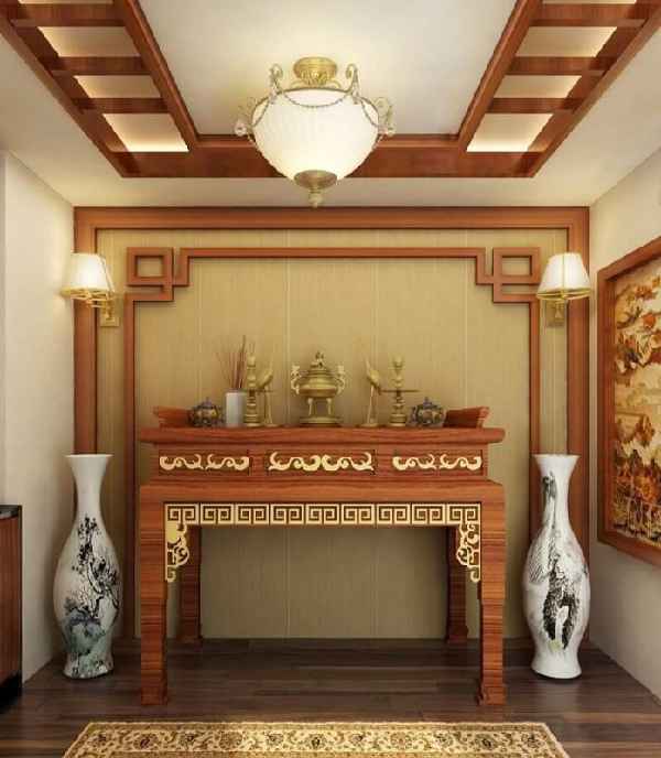 Nếu như chiếc đèn gắn trần thạch cao phía trên còn chưa rõ ràng để gia chủ có thể trông thấy thì hãy theo dõi mẫu tham khảo tiếp theo được giới thiệu. Về tổng thể gần giống với mẫu thiết kế bên trên chỉ khác ở một số điểm như: Hai bình gốm hai bên sử dụng chân đế bằng gỗ còn bình gỗ được làm gốm sứ với hoạ tiết núi sông hùng vĩ. Tường phía sau bàn thờ làm bằng gỗ ép để nổi bật chiếc bàn thờ phía trước. Bên trái của căn phòng là bức trang tứ bình với 4 loài cây quý hiếm biểu trưng của quân tử. Một chiếc bàn nhỏ được đặt sát tường, bên dưới bức tranh và đặt một bàn trà nhỏ. Hai bên bàn bố trí hai tiểu cây cảnh phù hợp với không gian thờ tự của gia đình.