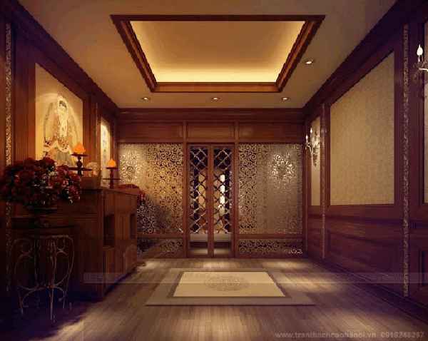 Nói tổng quát về không gian này với phần tường hai bên dán giấy với hoạ tiết phù hợp với không gian thờ cúng. Không gian bàn thờ đồ nội thất bằng gỗ tự nhiên với màu nâu đậm. Phần sàn nhà sử dụng tấm gỗ ép sang trọng, có độ bóng. Phần trần sử dụng trần thạch cao giật cấp để nhấn mạnh giúp cho không gian ấy rộng rãi, uy nghiêm. Phần giật cấp nhẹ nhàng để phù hợp với không gian nhỏ bé này. Tone màu trắng được sử dụng kết hợp với những chiếc đèn led trắng nhỏ xung quanh viền mang đến ánh sáng vừa đủ cho không gian nhà. Thêm một chiếc đèn chùm kiểu dáng hiện đại lấy cảm hứng từ những chiếc đèn trong cung đình ngày xưa nhưng đã được cách điệu cho phù hợp với nhịp sống hiện nay. Chiếc đèn này hoàn toàn phù hợp với không gian tâm linh như vậy.