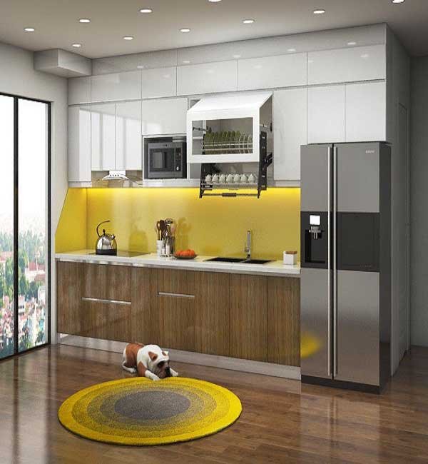 Nếu thích màu sắc nhẹ nhàng trang nhã thì bạn có thể lựa chọn mẫu thiết kế tủ bếp này của chúng tôi. Màu vàng nhạt kết hợp với gam màu trắng của tường càng khiến cho căn bếp nhà bạn lúc nào cũng trở lên tươi mới và cuốn hút. Cả thiết kế ngăn dưới hay ngăn trên của tủ bếp cũng chia thành rất nhiều ngăn nhỏ để quý khách để được rất nhiều đồ trong quá trình sinh hoạt.