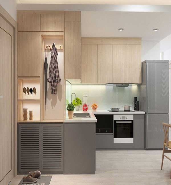 Khu bếp vừa rộng rãi, thoải mái vừa vừa không tốn quá nhiều diện tích. Với lối thiết kế độc đáo. Tầng trên của tủ bếp được thiết kế bằng gỗ, kín đáo, trang trọng. Bước vào căn chung cư một mặt của tủ bếp được thiết kế thành chỗ để giày dép, móc quần áo khi mới đi làm về để rẽ ngay sang phòng bếp thực hiện hiện đại, tiện nghi.