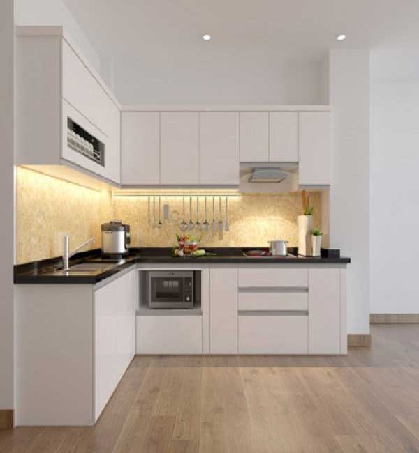 Đến với mẫu tủ bếp số 2 dành cho chung cư này chúng ta thấy một tủ bếp cao hình chữ L vừa có thể chứa được rất nhiều đồ đạc và vừa tiết kiệm không gian một cách tối ưu nhất. Hơn nữa mẫu tủ bếp này sử dụng gam màu sáng khiến phòng bếp càng trở lên rộng rãi, thoáng đãng. Chúng tôi hiểu rằng đối với ngôi nhà chung cư thì diện tích có phần eo hẹp. Chính vì thế mà chúng tôi đã đưa vào bài viết những mẫu tủ nhỏ nhắn, xinh xắn và phù hợp với diện tích phòng. Mang lại cảm giác thoải mái nhất cho người đầu bếp.