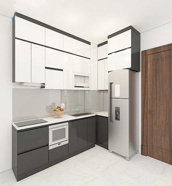 Màu đen sẽ làm bật tone màu trắng ở tầng 1 của tủ bếp, tầng 2 tủ trắng sẽ làm bật tone của viền đen. Hai màu này kết hợp, hòa quyện vào nhau để tạo ra một sản phẩm đang được thiết kế ở rất nhiều căn bếp nhỏ của mọi gia đình trên nẻo đất hình chữ S. Mẫu tủ bếp chữ L này sẽ rất phù hợp với không gian phòng bếp có phần nhỏ hẹp, hãy thử ngắm nhìn nếu nó phù hợp với gia đình bạn nhé.