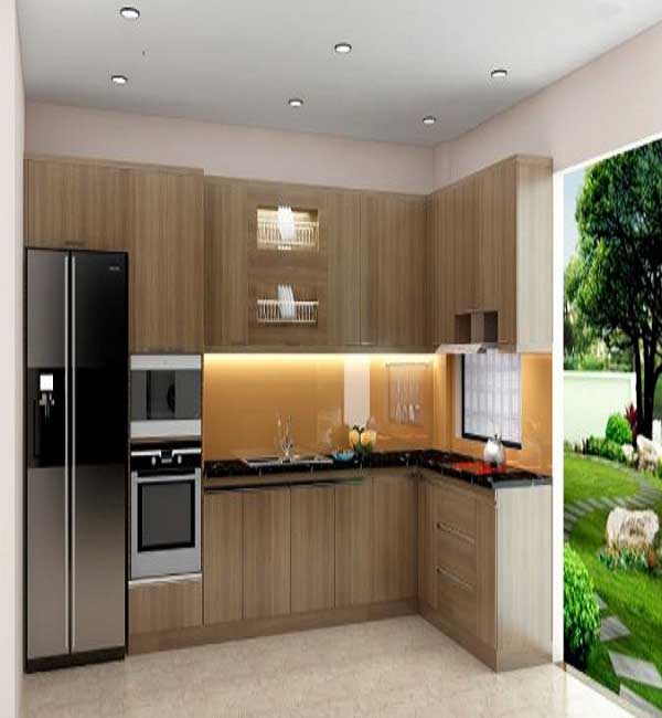 Nếu thích tủ bếp với chất liệu bằng gỗ, thiết kế hình chữ L gọn gàng, đẹp mắt thì bạn có thể hoàn toàn lựa chọn mẫu tủ bếp này. Cách thiết kế tương đối đơn giản, nhã nhặn nhưng lại mang đến cho căn bếp một vẻ đẹp nhẹ nhàng, không gian được mở rộng, giúp cho công việc của những người nội chợ trở nên thuận tiện nhất.