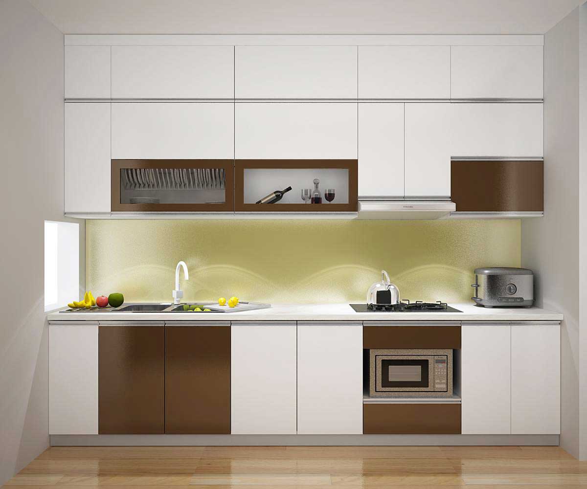 Chỉ với 3m, kiểu dáng hình chữ I nhưng chúng ta không thể phủ nhận về vẻ đẹp của mẫu tủ bếp này mang lại. Màu trắng là màu chủ đạo kết hợp với màu nâu tạo nên một sự khác biệt, độc đáo cho mẫu tủ bếp mini này,