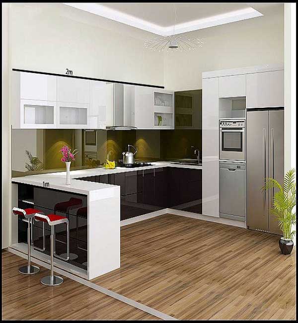 Vẫn là diện tích 3m nhưng ở phong cách này có sự khác biệt. Hình dáng tủ bếp mini chữ U gọn gàng, ngăn nắp. Bạn có thể tận hưởng ngay bữa sáng tại bàn bếp thuận tiện. Ở tầng 1 của tủ bếp này đã được thiết kế với một màu đen sáng bóng, sạch sẽ trong quá trình sử dụng. Tầng 2 của tủ bếp này được thiết kế với màu trắng của sự tươi mới, trẻ trung.