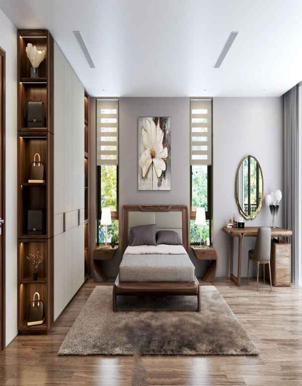 Làm nên ấn tượng với người nhìn về thiết kế nội thất phòng ngủ gỗ óc chó đó là hệ thống nội thất thông minh, hiện đại. Giường ngủ hiện đại tích hợp với kệ để đồ. Bàn trang điểm tích hợp với bàn làm việc và kệ ti vi và sát ngay bên cạnh đó là tủ để túi xách, kính hàng hiệu mang đến không gian mở tinh tế, tối ưu diện tích sử dụng mà không kém phần tiện lợi cho gia chủ.