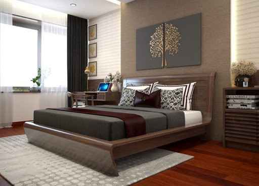 Chiếc giường ngủ màu nâu trầm kết hợp với chiếc tap cùng màu hoặc sự xuất hiện của chiếc kệ tivi tích hợp hệ trang trí sẽ mang đến cho không gian phòng ngủ của bạn vẻ đẹp lịch lãm, đẳng cấp.