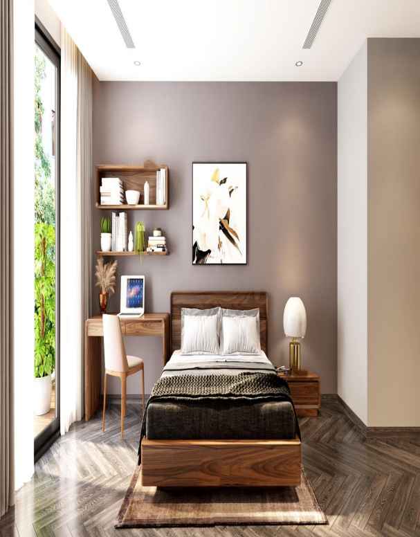 Màu vân gỗ óc chó tự nhiên, sang trọng làm cho không gian phòng ngủ ấn tượng hơn. Phòng ngủ được thiết kế thêm cửa kính bản lớn giúp tận dụng tối đa ánh sáng tự nhiên, làm cho không gian phòng ngủ trơ nên tinh tế hơn.