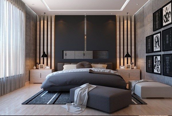 Đặt màu đen trong không gian phòng ngủ màu xám và thắt chặt. Một chiếc giường có màn trang trí màu đen được trải trên một tấm thảm với tường xám nhạt, một bên là xám đậm và sàn nhà màu xám. Cơ bản là một bức tường màu xám nhạt nhưng bằng cách kê một bức tường màu xám đậm ở bên, toàn bộ không gian có nội thất rất cân đối. Khung tán đen và những mảng tường sẫm phối 2 bên trái phải nên rất cân đối. Ngoài ra, khung màu đen là toàn bộ không gian tạo nên sự sắc nét của nội thất. Bên cạnh đó, nên điểm xuyết những đồ nội thất màu trắng đen xen vào xám để tạo điểm nhấn. Phối 1 chiếc tủ màu trắng trên nền tường xám đậm khiến nó trở thành một món đồ nội thất vô cùng thời trang cho phòng ngủ. Xám và trắng kết hợp vô cùng ăn ý từ trước tới nay, là sự giao hòa giữa nội thất hiện đại và đương đại. Vấn đề cần chú ý một chút chính là làm cho màu xám của bức tường tối hơn 1 chút, những màu tối vừa phải có thể tận hưởng sự tương phản của màu sắc.