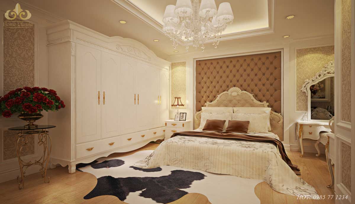 Phòng ngủ cũng có thể thiết kế thành một không gian đẳng cấp không khác gì vua chúa ngày xưa. Đầu tiên là gam màu quý tộc, rồi từ trong đó chọn lựa ra một màu trầm ấm, tạo cảm giác dễ chịu thư thái, thích hợp để nghỉ ngơi. Và với phòng ngủ, trên tường có thể là những chi tiết nổi bật đặc sắc như một chiếc mặt trời được khắc lớn, 2 bên đối xứng là cửa sổ, và chiếc bàn trang điểm, chiếc đèn ngủ sang trọng và đẳng cấp. Bạn có thể tạo điểm nhấn ngay cả bằng chiếc bàn để những bó hoa hồng quý phái. Hay đặt chiếc thảm nhà màu sữa, chất liệu mềm mịn như lông dê,… chúng vừa giúp căn phòng đẹp hơn lại giúp bàn chân luôn được giữ ấm trong những ngày đông. Ngoài ra với phong cách này, dù là phòng nào đi chăng nữa, thì cũng không thể bỏ qua chi tiết trang trí là cái đèn trùm sang trọng phía trên, đây là một chi tiết đắt giá thường gặp trong trang trí này.