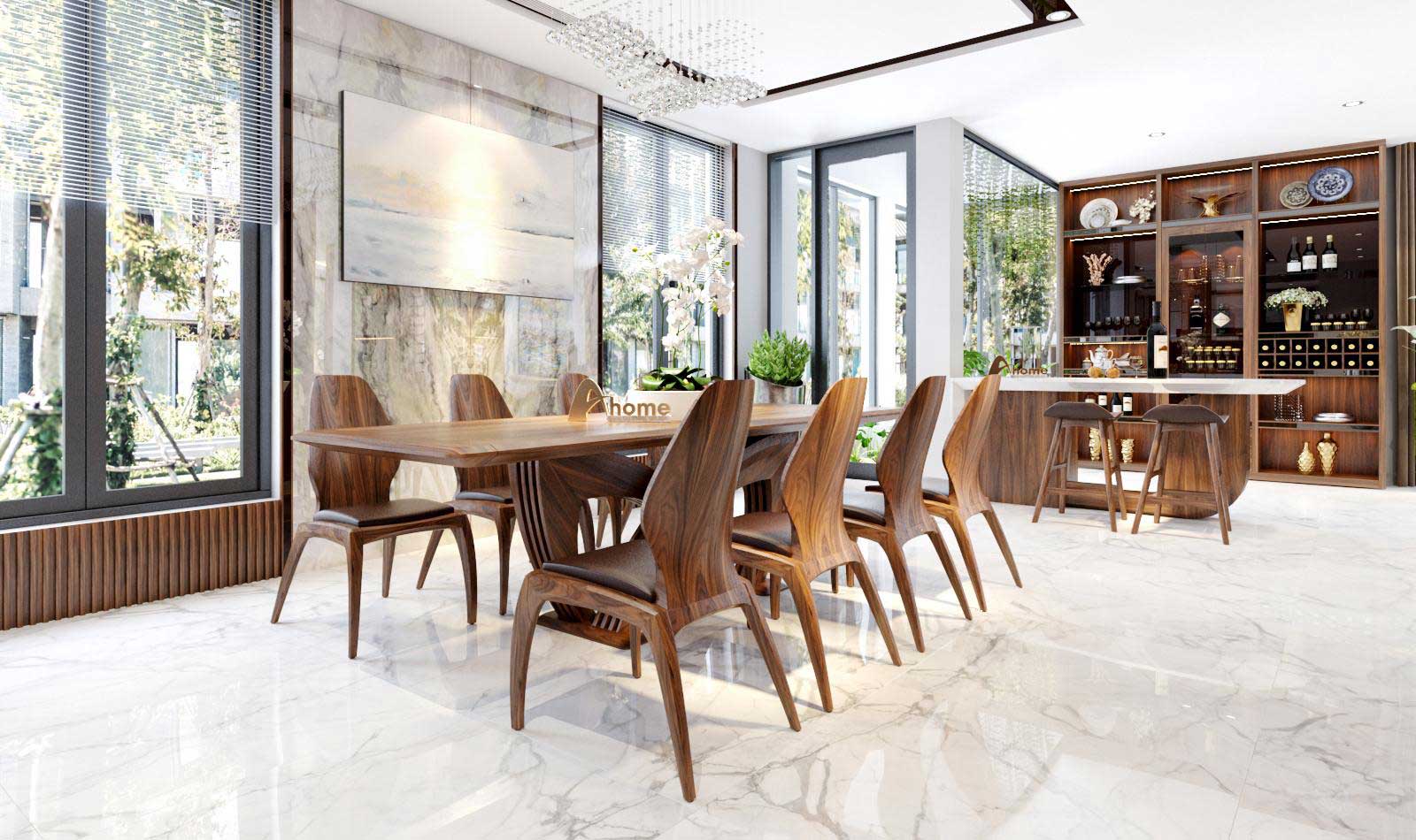 Phòng bếp thì chúng ta nên bố trí tập trung các nội thất như tủ lạnh gần với bếp nấu và gần bồn rửa bát. Chúng ta nên bố trí bàn ăn cách xa bếp nấu khoảng 2m tùy theo diện tích của căn phòng, Tránh hơi nóng của bếp khi nấu và mùi ám từ thức ăn.