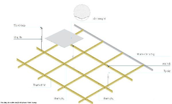 - Các tấm trang trí: Các tấm trần sẽ được đặt lên các hệ thanh (chính, phụ, viền tường) tạo thành bề mặt trần trang trí.
