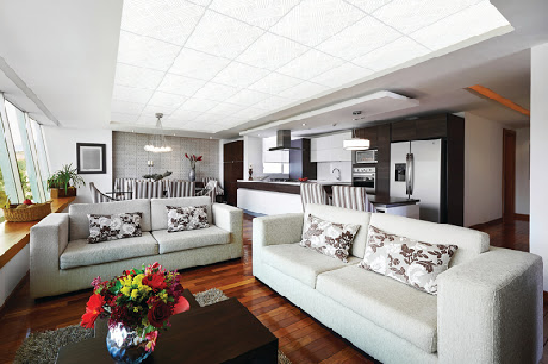 Trong không gian nhà ở dân dụng như thiết kế minh hoạ được đưa ra ở bên trên dây đang áp dụng kiến trúc theo phong cách hiện đại. Nói qua một chút về tổng thể thiết kế của không gian ngôi nhà này là tone màu trắng nhã nhắn, nhấn ở khung gỗ sẫm màu. Từ lối vào theo thứ tự sắp xếp là không gian bếp rồi đến không gian phòng khách. Nói cách dễ hiểu hơn là phòng khách và bếp được nối thông theo chiều ngang để gia chủ sở hữu có được một không gian rộng rãi nhất. Đây là thiết kế điển hình của căn nhà chung cư hay căn nhà vườn hiện nay. Để phù hợp với không gian này thì mẫu trần thạch cao khung nổi sẽ áp dụng kiến trúc tương ứng. Phần khung nổi hiện rõ ràng thông qua lắp đặt hệ thống đèn âm tường bên trong kết hợp cùng với chất liệu pha lê. Khi ánh đèn bật sáng, phần pha lê phát huy tác dụng của nó với ánh sáng trong trẻo, rực sáng giúp cho toàn bộ không gian nhà rộng rãi hơn rất nhiều.