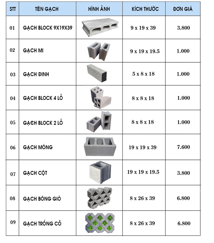 Bảng giá gạch BLock