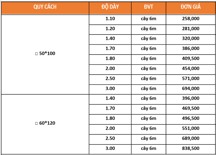 Thép hộp vuông đen có độ bền và tính chịu lực cao và khá nhẹ nên dễ dàng vận chuyển thi công. Loại thép này được sử dụng phổ biến trong xây dựng như làm khung chịu lực nhà cao tầng, làm nền nóng công trình lớn, khung nhà xưởng… Để biết rõ hơn về giá thép hộp vuông đen, các bạn hãy tham khảo bảng sau đây.