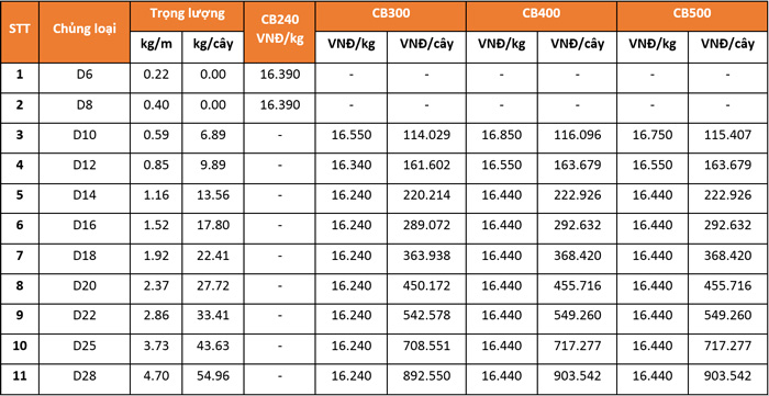 Trên thị trường hiện nay có nhiều loại thép xây dựng khác nhau, nhưng thép Việt Đức vẫn được nhiều khách hàng tin tưởng bởi giá thành cạnh tranh. Để biết rõ hơn về mức giá bán thép Việt Đức 2024, các bạn hãy theo dõi bảng sau đây.